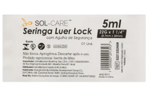 Descrição: SERINGA DESCARTÁVEL SOL-CARE 5ML COM GRADUAÇÃO NÍTIDA, QUE NÃO SAIA COM FACILIDADE, BICO LUER LOCK, COM ÊMBOLO PLÁSTICO COM PROTEÇÃO DE BORRACHA NA PONTA, SILICONIZADO, COM CORTE E AJUSTE PERFEITOS, DISPOSITIVO DE SEGURANÇA COM RETRAÇÃO TOTAL DA AGULHA PARA O INTERIOR DO CILINDRO, COM MANIPULAÇÃO ATÉ A MARCA ZERO, ONDE NÃO POSSIBILITE SOBRA DE MEDICAMENTO NO INTERIOR DA SERINGA, CONTROLANDO A ADEQUADA ADMINISTRAÇÃO DO MEDICAMENTO, COM BOA VISIBILIDADE. EMBALAGEM INDIVIDUAL, LOCAL APROPRIADO PARA ABERTURA ASSÉPTICA, EM PAPEL GRAU CIRÚRGICO COM FILME TRANSPARENTE E DADOS DE IDENTIFICAÇÃO CONFORME RDC 185/2001. COM TODOS OS DADOS DE IDENTIFICAÇÃO DO PRODUTO, PROCEDIMENTO, MÉTODO DE ESTERILIZAÇÃO, DATA DE FABRICAÇÃO E VALIDADE.